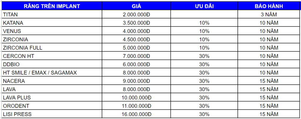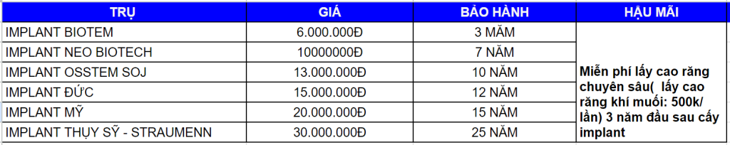 Chi phí làm răng Implant đơn lẻ trên thị trường hiện nay dao động từ 26.000.000 – 43.000.000 VNĐ/Răng, tùy vào loại trụ và mão răng sứ. Còn chi phí trồng răng Implant toàn hoàn thường dao động từ 170.000.000 – 325.000.000 VNĐ/Răng. Dưới đây là bảng giá trồng răng Implant tại Ngọc Tuấn mà bạn có thể tham khảo: